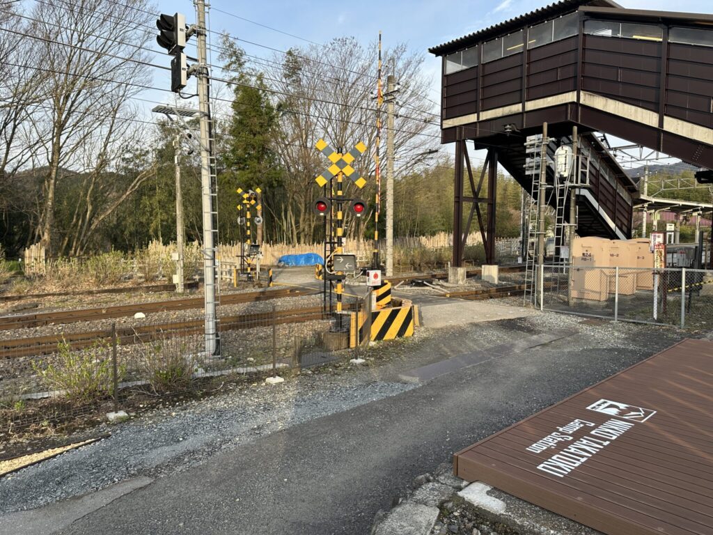 「高徳中岩河川公園」の看板を右に踏切を渡る